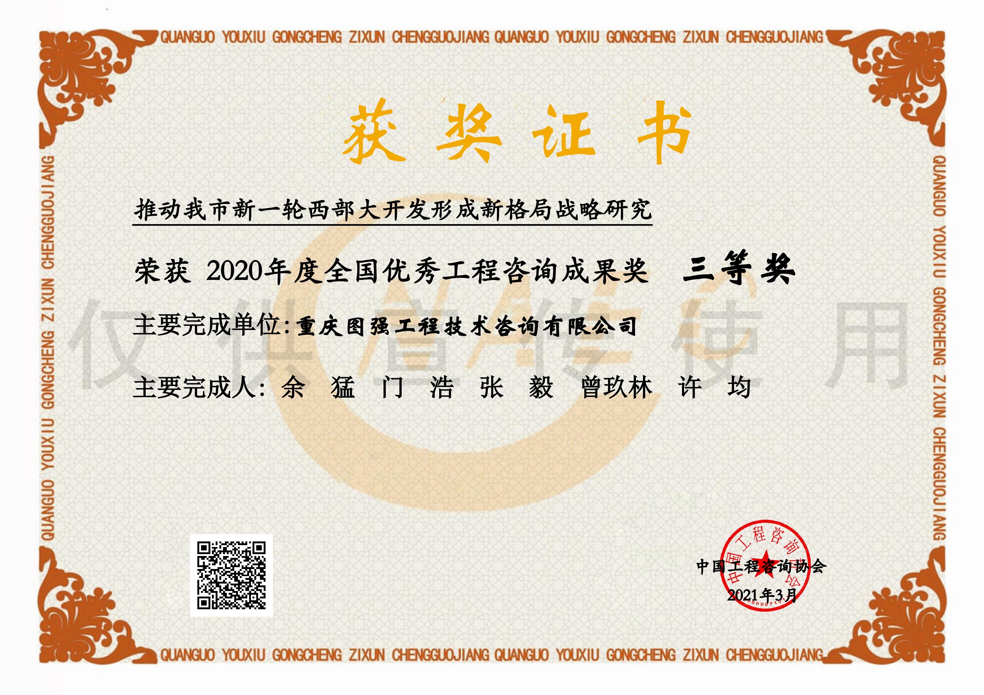 重庆图强工程技术咨询有限公司(以下简称图强咨询)为立足重庆、服务全国的新型智库和全过程工程咨询机构。总部位于重庆市两江新区财富中心。公司为中国投资促进会、中国工程咨询协会副会长单位,中国建设工程造价管理协会会员单位,重庆市工程咨询协会、重庆市建设工程造价管理协会、重庆市环境产业协会、重庆市生态学会、重庆市水保学会等副会长单位。国家高新技术企业。重庆市AAA劳动和谐企业。两江新区优秀民营企业。拥有国家专利20余项,编制国家和地方团标两项。获得全国优秀工程咨询成果奖多项。